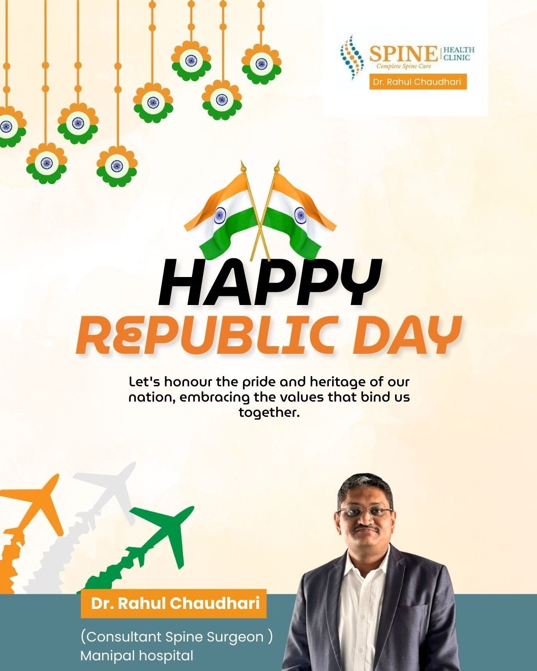 Happy Republic Day. Let us honour our nation by staying strong, active, and pain free. At Spine Health Clinic, we are dedicated to improving spine health and mobility through expert care and personalized treatment. Thank you for trusting us with your wellbeing. Together, we can move towards a healthier tomorrow and a stronger India.