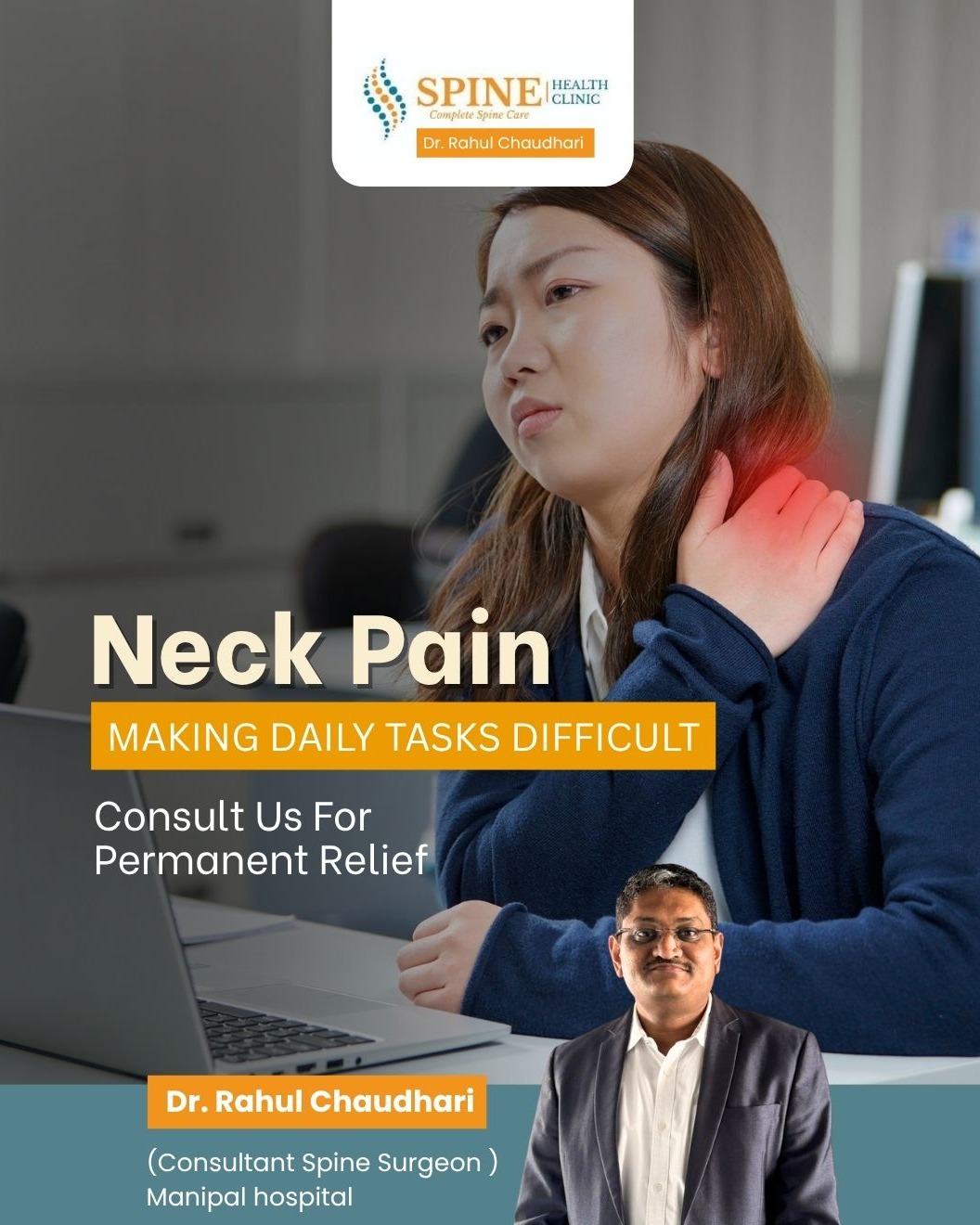 Neck pain making your daily tasks difficult? π£ Long screen hours, poor posture, or stress can strain the neck muscles, leading to stiffness, headaches, and restricted movement. Ignoring it can worsen the problem and affect your spine alignment. The good news most neck pain can be managed with proper diagnosis, posture correction, and targeted treatment. Early intervention helps prevent chronic pain and nerve compression. Donβt let neck pain affect your work or lifestyle take control today for a pain-free, active life! πͺ Get expert advice from Dr. Rahul Chaudhari, trusted Orthopaedic and Best Spine Surgeon at Manipal Hospital. Right guidance can make all the difference! Consultation Timings: Manipal Baner OPD β Tue, Thu, Sat: 1:00β3:00 PM & 5:30β7:00 PM Manipal Kharadi OPD β Mon, Wed: 1:00β4:00 PM π Manipal Hospital: 020 6813 8888 Spine Health Clinic β Mon, Wed, Fri: 5:00β7:00 PM π Clinic: 8010130003 π Visit: drrahulchaudhari.com Visit the Spine hospital in Baner for expert diagnosis and relief. Consult an experienced Orthopedic doctor in Pune and Spine specialist in Balewadi for lasting recovery. Get advanced Endoscopic spine surgery in Baner, Laser spine surgery in Baner, and Minimally invasive spine surgery in Balewadi from the Best spine surgeon in Wakad. #neckpain #spinecare #orthopaedics #drrahulchaudhari #spinespecialist #manipalhospital #pune #backpainrelief #spinehealth #posturecare