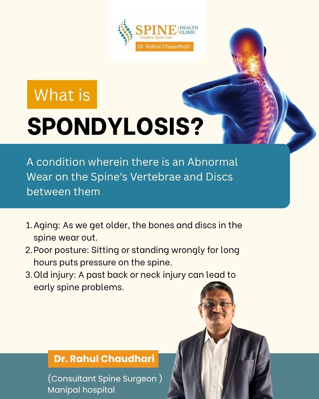 Spondylosis is the natural wear and tear of the spine’s bones and discs a condition that develops slowly with age. 🦴 Common causes include aging, poor posture, and previous back or neck injuries. These changes can lead to stiffness, pain, and reduced flexibility, especially in the neck or lower back. Ignoring early signs may cause nerve compression or chronic discomfort. Maintaining good posture, regular exercise, and timely medical care are key to managing spondylosis effectively. Don’t wait for pain to limit your movement early diagnosis ensures lasting relief and better spine health. 🌿 Get comprehensive spine care at the Spine hospital in Baner from a top Orthopedic doctor in Pune. Consult a leading Spine specialist in Balewadi and Best spine surgeon in Wakad for advanced Endoscopic spine surgery in Baner, Laser spine surgery in Baner, and Minimally invasive spine surgery in Balewadi for lasting relief.
